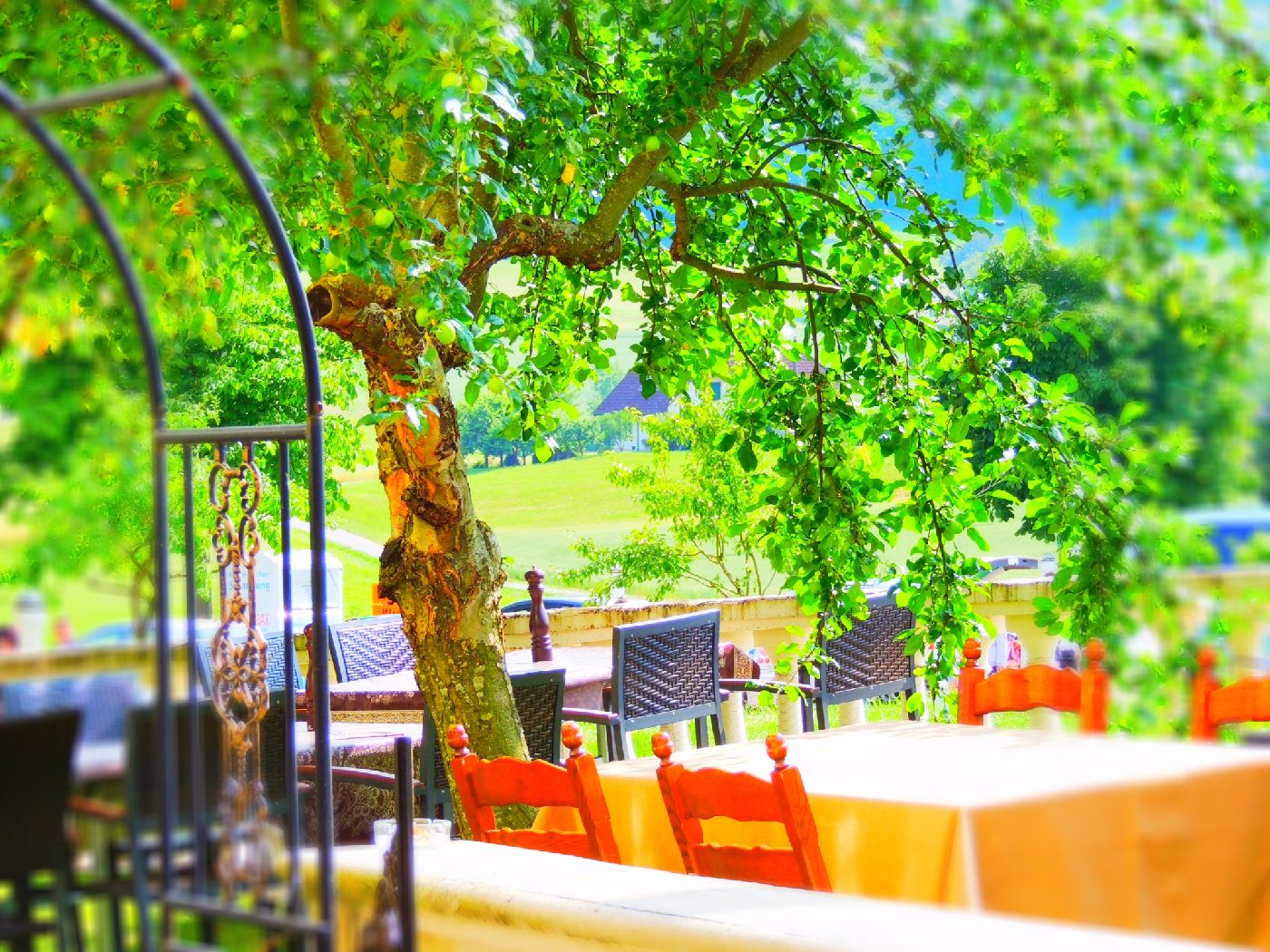 Im Sommer kann man auf der schönen, grossen und abgedeckten Terrasse eine wunderbare Aussicht auf das ganze Dorfpanorama geniessen oder, nach einer Wanderung auf dem Chaisacherturm, sich ein feines, hausgemachtes Dessert gönnen, während sich die Kleinen auf dem grossen Spielplatz aufhalten.